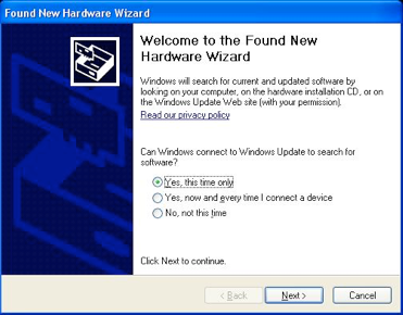 ‣4. The “Found New Hardware Wizard” should display again as seen in the picture to the right. Select “Yes, this time only” and click “Next>” to have Windows search for the appropriate FTDI driver.