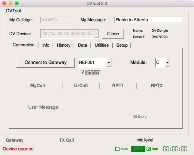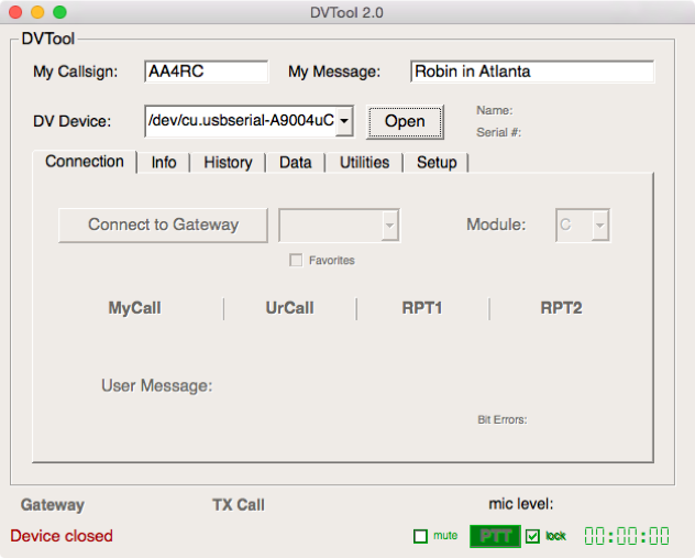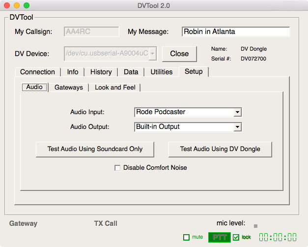 Start the DVTool application by double clicking on the DVTool icon on your desktop. This brings up the main application window shown above. If you receive a popup dialog stating that no devices were found, close the application and make sure your DV3K Dongle is plugged in and the green LED is slowly pulsing. You may need to install the FTDI USB device drivers by following the steps in the Installation page above. You should have a device shown in the “DV Device” box. On Windows, this will look like “COMxx”. On Mac O/S X, this will look like “/dev/cu.usbserial-A9xxxxxx”. On Linux, this will look like “/dev/ttyUSBx”.