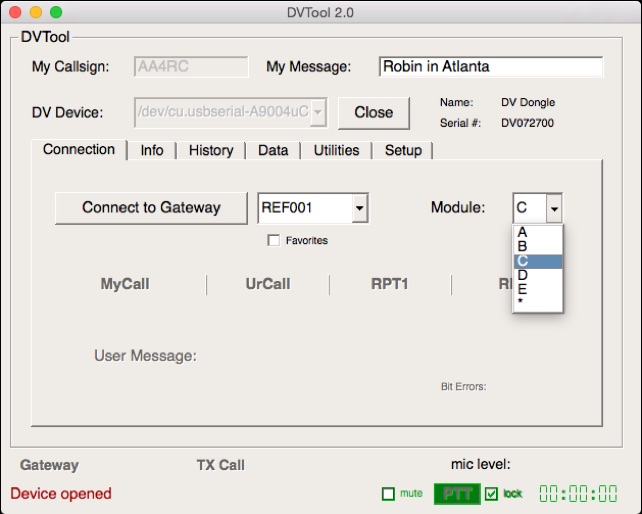 Select the module for the remove gateway/reflector using the “Module” box. Module “C” is the most common. If you select the “*” module, you can monitor all of the modules on the remote system but you cannot transmit. Once you hear a conversation, switch to the module used by the talkers so you can transmit.