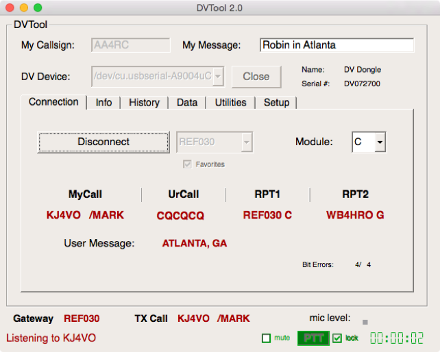 While you are connected to a gateway/reflector, click on the “Info” tab to get information about the connected system. Click “Get Gateway Info” to retrieve linked repeaters, DV Dongle, last heard users, and local date/time at the system.