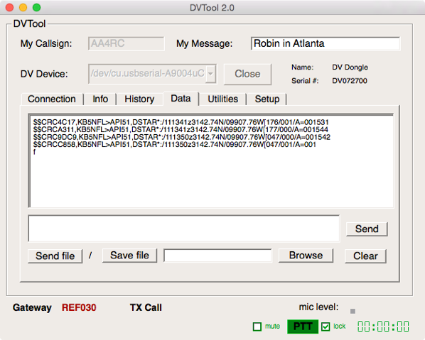 Click on the “Data” tab to see the raw data from the D-STAR protocol. This can include GPS, typed text, and D-RATS type data. You can send a message by typing it into the box next to the “Send” key and clicking “Send”. You can also send/receive files. Use the “Clear” button to clear the data info box.
