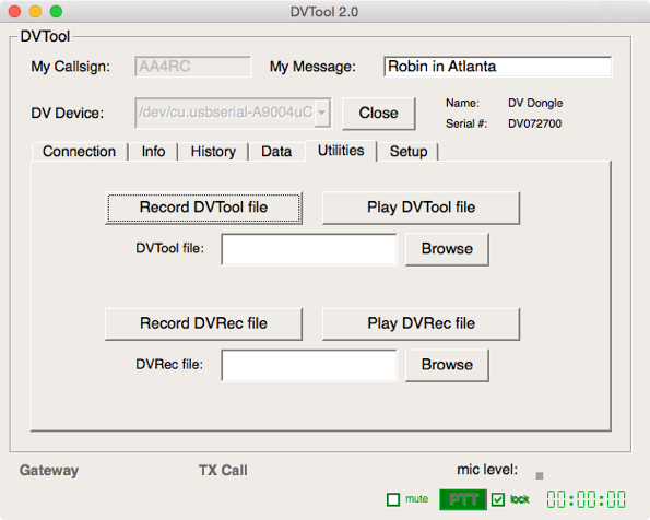 You can record and play DVTool/DVRec files using the “Utilities” tab. These files can be used to record announcements for your local repeater or customize the audio from DVTool like “Remote System Linked”.